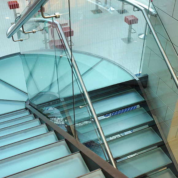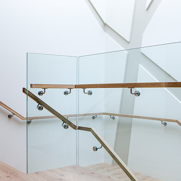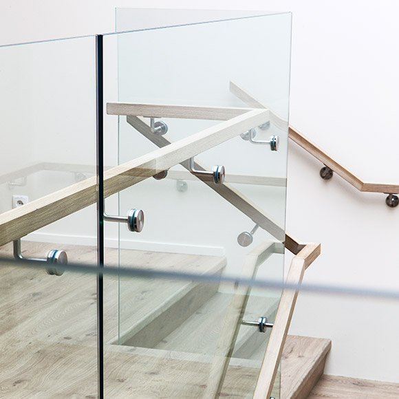 Glerhandrið er frábær lausn til að viðhalda birtuflæði um rýmið. Útfærslur á handriðum fara yfirleitt eftir því hvernig það er fest. Við mælum með að gler í handrið og annars staðar þar sem hugsa þarf um fallvarnir að notað sé samlímt gler. Stundum er glerið boltað með punktfestingum eða boltum að neðan í gegnum glerið og í gólfplötuna. Mikilvægt er að festa glerið án þess að þvinga það að gólfplötunni. Gler sem er þvingað og er undir spennu getur brotnað. Í öllum útfærslum mælum við með að settur sé handlisti til styrkingar á handriðinu.